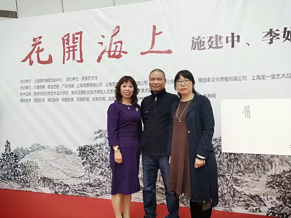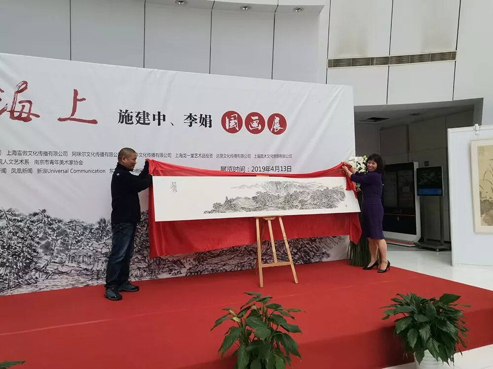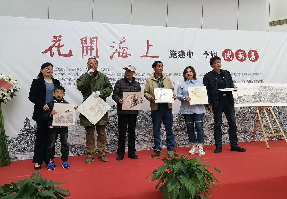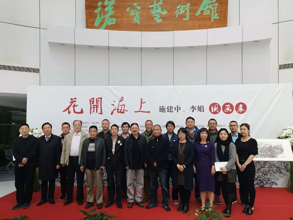 4月13日上午,以“花开海上”为主题的施建中、李娟国画作品展在上海诺宝艺术馆开幕。