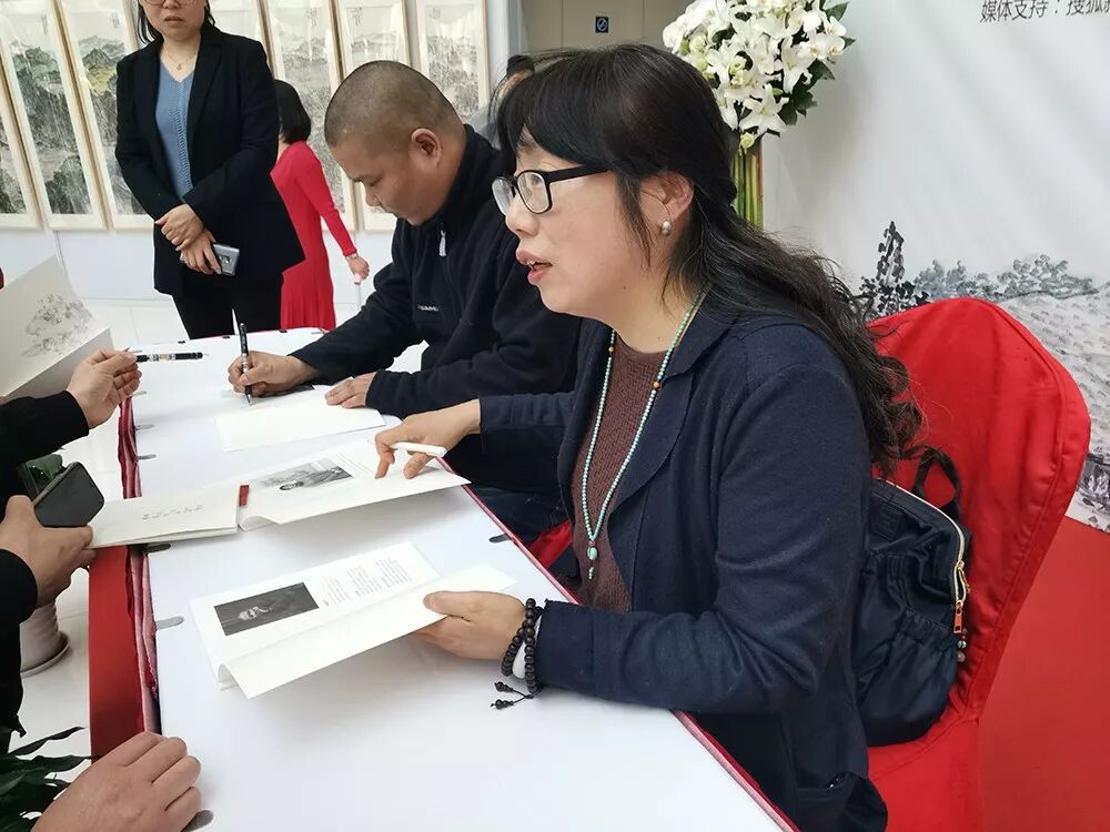 ▲施建中、李娟夫妇为参观者签名留念