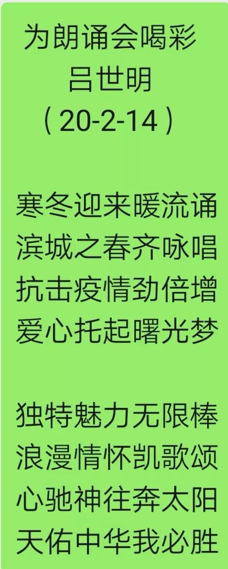 这次诗歌朗诵会别开生面,始终洋溢着热烈的气氛,为抗击疫情增添力量,取得了圆满成功。这真是:无碍有爱朗诵群,名家吟诗抗疫情。彰显爱心献力量,艺术天地添一景。在此之前的2月1日,大连市残疾人朗诵艺术学会还在微信残疾人朗诵园地专门组织了“为武汉加油”诗歌朗诵会,有10位来自不同岗位的残疾人朗诵爱好者进行了热情的朗诵,表达了战胜疫情的决心。