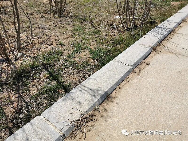 (二)无障碍园路设计具有较高的规范性。大连属于丘陵地区,地势起伏较大,纵坡坡度超标是园路最常见的问题。不规范则意味着存在一定程度的障碍。按照《无障碍设计规范》的要求,主路纵坡不应大于5%(山地公园不大于8%),支路和小路纵坡不大于8%。按照《公园设计规范》,主路纵坡应小于8%(山地公园小于12%),支路和小路应小于18%(超过15%,应做防滑处理)。根据我们的经验,12%(约为1:8)应是园路无障碍通行的上限。目前,大连地区的公园以山地公园和滨海公园居多。山地公园园路坡度达标率很低。滨海公园地势较为平坦,园路规范性相对较高。航海主题公园的园路坡度目前而言都达到了国家标准,园路纵坡在8%左右。