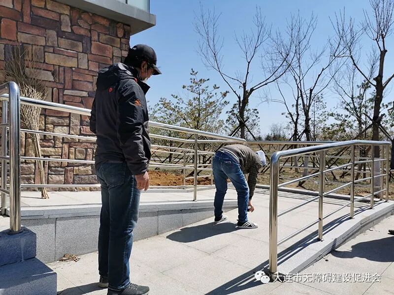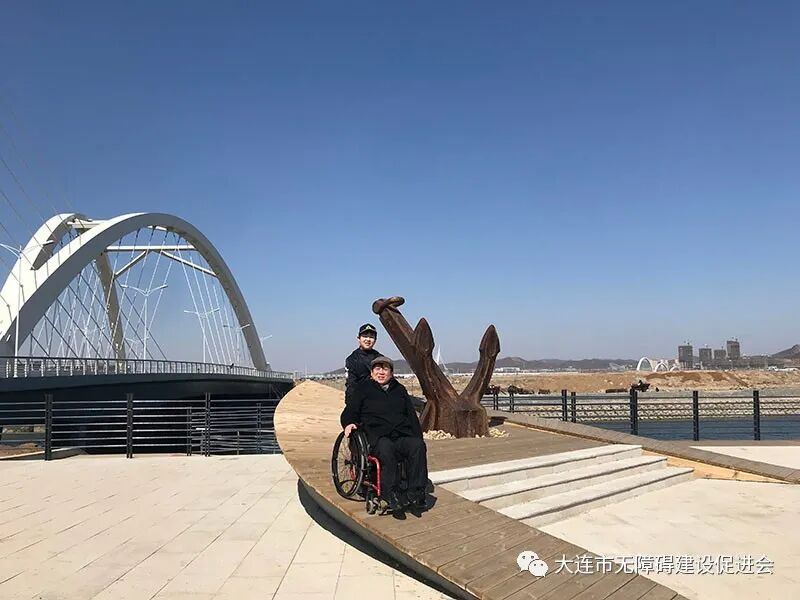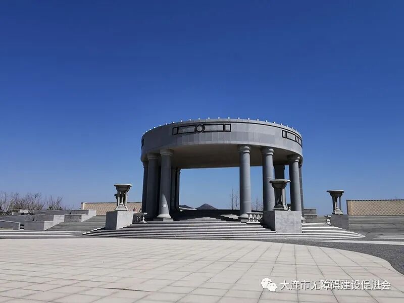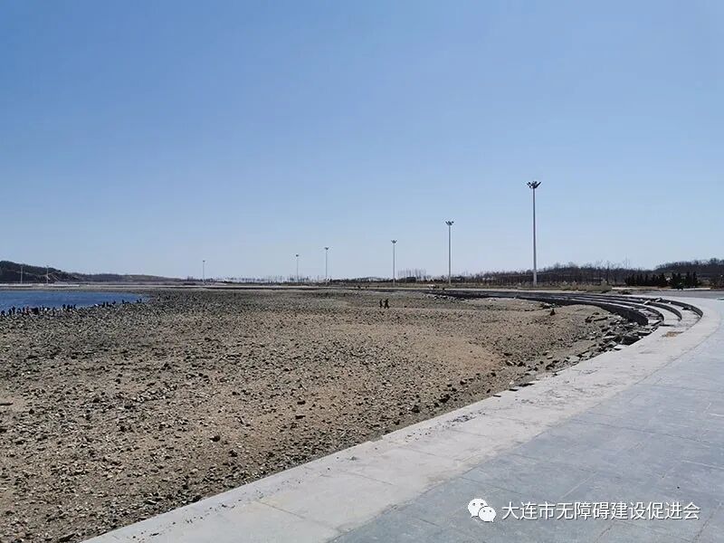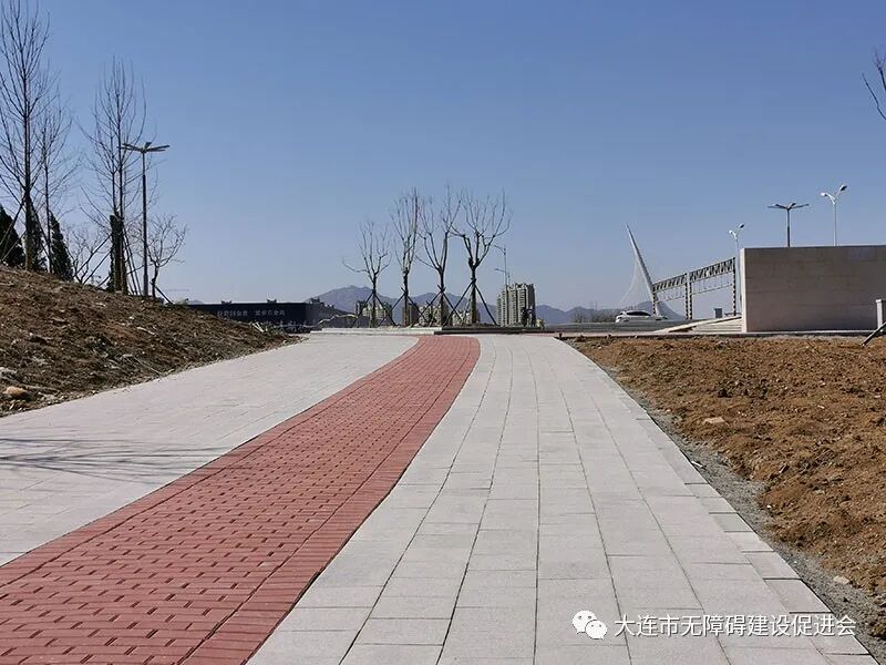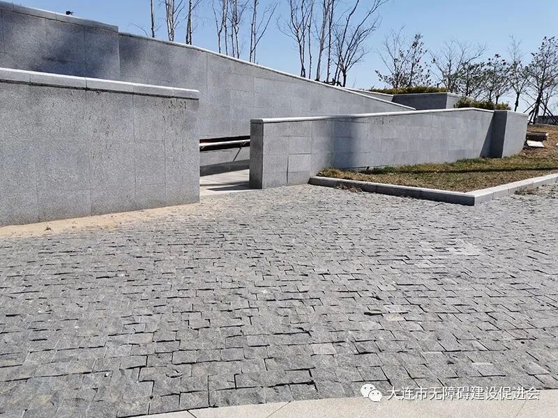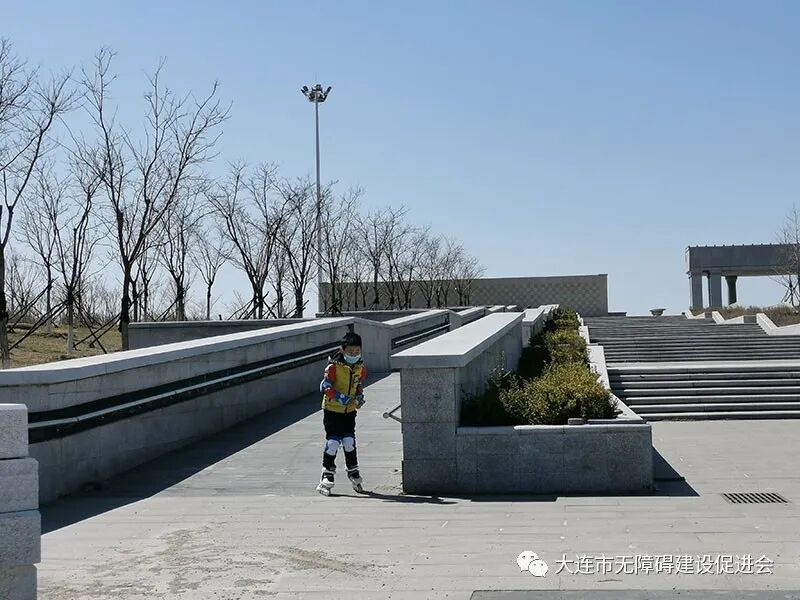 (一)园路构成多循环的闭合无障碍系统。主要体现为两个特点:1、台阶或梯道处必有无障碍坡道。比如,在航海主题公园的主出入口,伫立着微缩版的大连港客运站半圆形的玄关(原建筑2013年已被拆散)。在玄关两侧分别修建了两层折叠式无障碍坡道(原建筑没有坡道)。公园设计考虑到无障碍需求,在两侧较为含蓄地设置了无障碍坡道——既没有破坏原建筑的风貌,又为传统设计增加了现代意义。2、无障碍坡道通达处皆可通过平缓下降的园路从另一端通达,即:每个局部都可以构成无障碍环路。比如:在蜗牛桥附近的出入口,我们可通过无障碍坡道进入滨海步道,也可以沿着缓坡、通过园路到达同一地点——游客既可通过轮椅坡道较为快速地到达滨海步道,也可通过缓慢降低的园路进入滨海步道。非单线闭合的局部微循环与整体大循环相结合,在大连其他公园中则极为罕见。大多数公园最多只修建一条单线的无障碍园路,既不能构成环路,也不能形成系统。目前该公园尚处于建设阶段,但预估园区的通达率至少在95%以上。