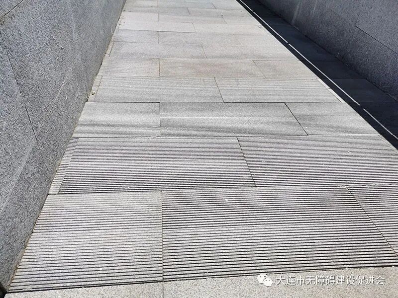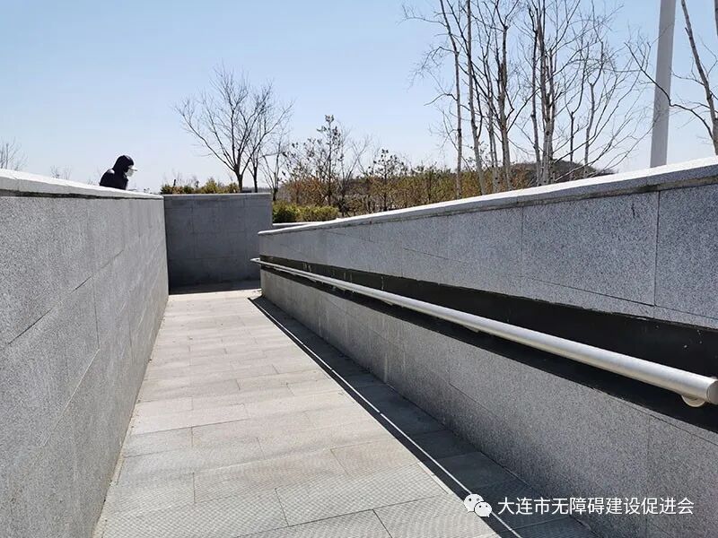 园路上无障碍坡道的规范性也非常重要。中轴线区多处(如大连港客运站微缩玄关的两侧)采用双层折返式轮椅坡道,根据高差不同坡度介于1:8到1:12之间,坡宽大于1.5m,坡面采用了细纹防滑处理。值得一提的是,中轴线区的无障碍坡道都是对称的,不仅美观,而且便捷——无论从任何方向来,就能最便利地使用无障碍坡道。我们看到,设计师把无障碍作为一种设计元素来使用。