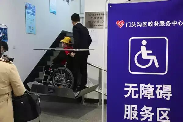 乘坐轮椅的肢体残疾人体验政务服务中心无障碍升降设备椅(央广网发 北京市残联供图)近日,门头沟区政务服务中心无障碍服务专区启用,“无障碍大综窗”开始试运行,能够咨询、帮办和受理大厅43个单位的1369个政务服务事项,以及100多个“百事套餐”主题事项,让更多有需求的群众享受优质服务。据了解,按照标准,在前期建设完成无障碍停车位、坡道、电梯、卫生间等设备设施的基础上,本次还新建了无障碍服务专区,设置了低位服务台,专门招录了手语、英语、日语等3名咨询和导办人员,录制了系列“双语”办事导航,配备了72种语言的智能翻译机,特制了8台无障碍自助机,设置了无障碍等候区,让办事人获得 “专区专窗专人专办”的“四专”暖心服务。比如,听力障碍朋友到“无障碍大综窗”办理业务时,可以与手语翻译工作人员进行交流,迅速了解办理业务的流程和要点。小李是一名听力障碍者,想要与朋友合开一家公司,今天到区政务服务中心咨询业务。到“无障碍大综窗”后,手语工作人员同他畅快交流,他很快就清楚了办理流程和办理要点。工作人员还告知他,如果准备好了,随时来窗口都能享受全流程无障碍服务。门头沟区政务服务中心相关负责人介绍,下一步,门头沟还将在区政府网站、移动端、自助端等办事平台开辟无障碍服务专栏,努力提供更贴心的便利化服务。