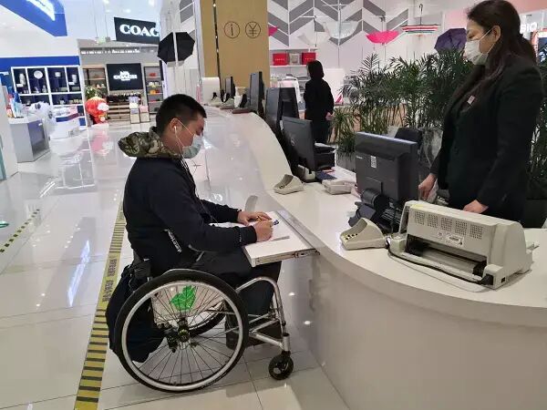 残疾人朋友体验北京长安商场的低位柜台(央广网发 北京市残联供图)据北京市残联相关负责人介绍,这次改造是按照《北京市进一步促进无障碍环境建设2019-2021年行动方案》中的规定,将无障碍建设纳入背街小巷整治、老旧小区改造等全市性重点工程。走访期间,记者发现,在深入了解周边社区居民、顾客无障碍出行需求的基础上,改造还涉及各大商场。以坐落于长安街沿线商圈内的北京长安商场为例,其转型实现了老年人、残疾人、儿童、孕妇和临时受伤者等特殊群体出行、购物、娱乐无障碍环境的目标。比如,电影院增设活动观影席,专门为每个影厅配备了可移动双用的活动座椅;还对各楼层的服务台和收银台均进行了改造,所有收银台、服务台都设置了低位服务台;同时针对周边居民老年人多的情况,商场对部分蹲位卫生间还配置了L型扶手,保证老年人的如厕安全……最让坐轮椅的残疾人头疼的问题也得到了解决。此次改造中,商场增加了一部扶梯、一部直梯,并将原有直梯梯井进行了升级,均可直达商场五层餐饮区,而此前直梯只能到达四层;对于个别无法设置坡道的台阶,也设置了可移动坡道,确保了轮椅、推车的无障碍通行。