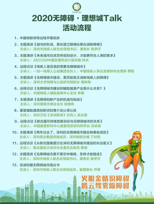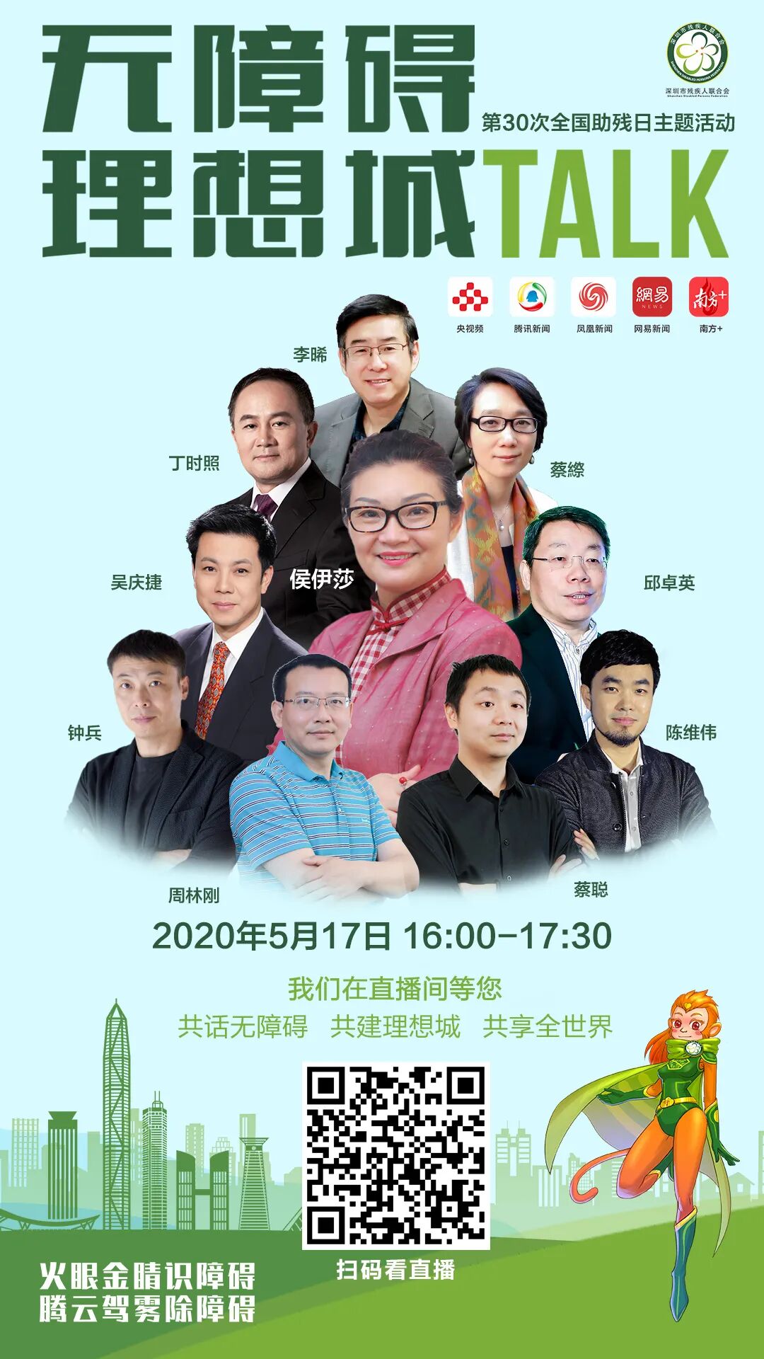 2020无障碍·理想城Talk 共话无障碍 共建理想城 共享全世界 为庆祝第三十次全国助残日,携手残疾人共创美好新生活,深圳市残疾人联合会将于2020年5月17日举行“无障碍·理想城Talk”活动。贯彻深圳创建无障碍城市的方针,宣传无障碍理念文化政策,动员全社会参与无障碍城市建设。 活动上,中国残疾人辅助器具中心主任李晞、中国康复研究中心康复信息研究所所长邱卓英、中国残疾人事业发展研究会理事蔡聪、联合国亚太经济社会委员会官员蔡縩等嘉宾将以远程访谈的形式参与活动。 深圳市残联理事长侯伊莎、深圳商报总编丁时照、深圳大学残障与公益研究院院长周林刚、草根天使会会长陈维伟、AECOM中国区建筑设计副总裁钟兵等将现场出席活动并进行主题演讲。 活动由深圳卫视知名主持吴庆捷担任主持人。 2 活动流程 活动将围绕着无障碍城市的理念、无障碍城市的建设路径、无障碍创新产业的发展,无障碍城市的未来等议题展开,将探讨城市与人的关系、城市应该怎样规划设计、残疾人是否真的需要无障碍城市、两年来无障碍城市建设有何进展、无障碍城市应该怎样建设等热点话题。 中国残联领导远程开幕致辞 主题演讲《城市的形成,是在建立障碍还是在消除障碍》主讲人:深圳市残疾人联合会党组书记、理事长 侯伊莎 主题演讲《未来城市应该怎样规划设计,才能更符合人类的需求》主讲人:AECOM中国区建筑设计副总裁 钟兵 远程访谈《残疾人是否真的需要无障碍城市》主讲人:一加一残障人公益集团合伙人、中国残疾人事业发展研究会理事 蔡聪 主题演讲《无障碍城市建设,是否能真正消除残疾人的障碍》主讲人:深圳大学残障与公益研究院院长 周林刚 远程访谈《辅助器具产业与无障碍城市是什么关系?》主讲人:中国残疾人辅助器具中心主任 李晞 主题演讲《无障碍创新产业的机遇与挑战》主讲人:深圳草根天使会会长 陈维伟 康复辅助器具创新项目推介及认领认投主持人:深圳卫视《深视新闻》主持人 吴庆捷 远程访谈《联合国可持续发展目标与无障碍城市的关系》主讲人:中国康复研究中心康复信息研究所所长 邱卓英 主题演讲《两年过去了,深圳的无障碍城市建设有哪些成效》主讲人:深圳报业集团党组成员、深圳商报总编 丁时 远程访谈《从联合国角度讨论深圳无障碍城市建设的长远意义》主讲人:联合国亚太经社会委员会官员 蔡縩 主题演讲《无障碍城市是不是空中楼阁,怎样才能建成》主讲人:深圳市残疾人联合会党组书记、理事长 侯伊莎 参与方式 3 认领认投 本次“无障碍·理想城Talk”活动上还将介绍10个入围征集和资助康复辅助器具需求目录的项目,并启动项目认领认投,呼吁全社会共同参与无障碍城市建设,给予康复辅具产业更多的支持。 4 直播平台 活动直播时间:2020年5月17日 16:00-17:30 活动直播平台:深圳残疾人微信公众号、“无障碍城市”抖音号、央视频APP、网易新闻APP、腾讯新闻APP、凤凰新闻APP、南方+APP END