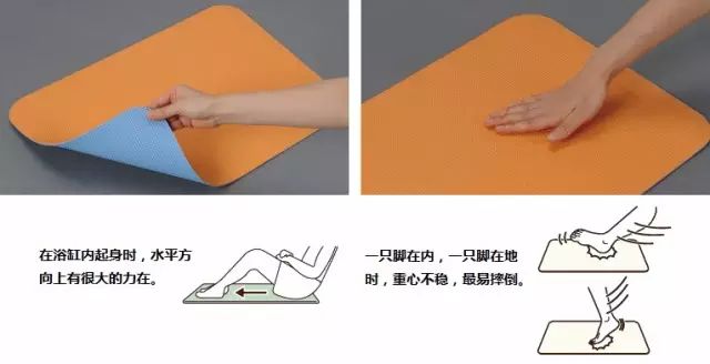 为浴缸内外安置防滑垫,老人不注意地移动,容易滑倒、或摔倒。