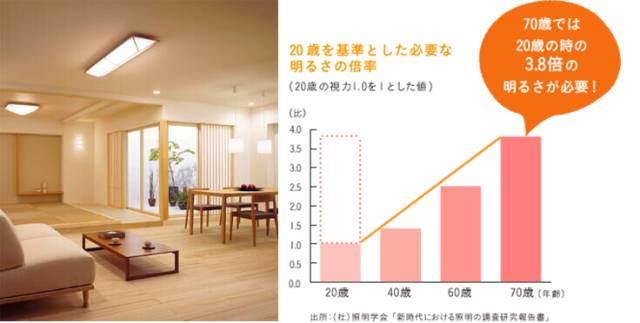 读字的照明,老龄人需亮度600~1500lx(年轻人的两倍左右)。