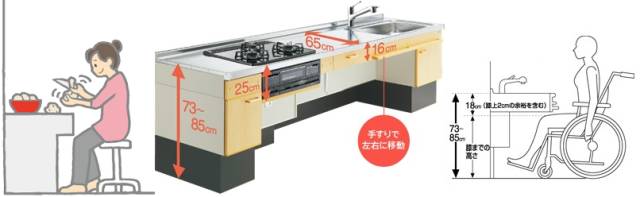 若为高龄人士(腿脚不便需轮椅老人),操作台根据使用者腿部情况高度+18cm=约73~85厘米左右。
