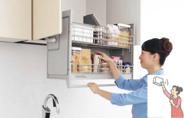 橱柜五金:橱房吊柜推荐使用升降类五金,减少踮起脚时平衡不当的危险(避免爬高),收纳应满足手方便拿取的设计。