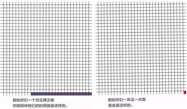 有一张图这么说,人生不过短短的900个月,画一个30×30的表格,一个A4纸就够了。对于父母:假如你们一个月见两次面,你能陪他们的时间就20格,假如你们一年就见一次面,你能陪他们的时间就那么短短1格。