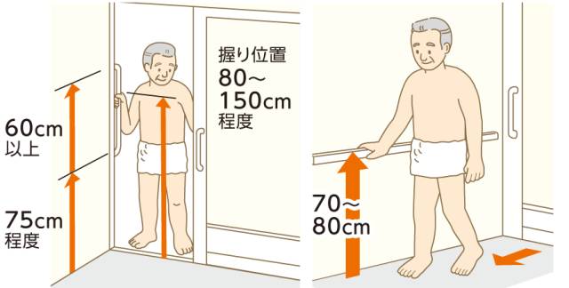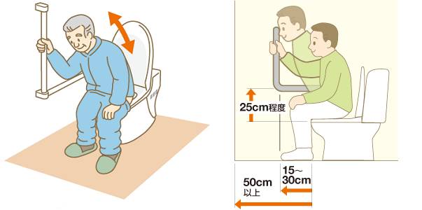 大家都知道起身的时候:手撑着的力气需要支撑整个身体,而由顺手处的扶手拉的过程则省力许多(可以自己做个试验),所以扶手的位置应设定在离马桶15~30mm的墙壁上。