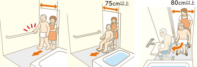 直接进入浴室时,需75cm以上;当进入需迂回时,门开尺寸至少80cm以上(洗浴过道容身处亦大于80cm);进入浴室路上应没有障碍。