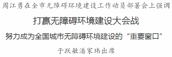 今天下午,我市召开无障碍环境建设工作动员部署会。省委常委、市委书记周江勇在会上强调,要深入学习贯彻习近平总书记在浙江、杭州考察时的重要讲话精神,进一步提高站位、深化认识,践行以人民为中心的发展思想,坚决打赢无障碍环境建设的大会战,全面提升无障碍环境建设水平,为亚残运会顺利召开提供坚实保障,努力成为全国城市无障碍环境建设的“重要窗口”。于跃敏、潘家玮、许明、缪承潮出席,陈卫强主持。省残联党组书记、理事长蔡国春讲话。市残联、市城管局、上城区、萧山区、市人大社会工委、市政协城市建设和人口资源环境委员会负责人作表态发言。周江勇指出,推进无障碍环境建设是提高城市能级和竞争力的内在要求,是高水平办好亚残运会的迫切需要,是创造老年人和残疾人美好生活的应有之义。各地各部门要认清形势、直面问题,充分认识无障碍环境建设的重要性和紧迫性,切实增强思想自觉和行动自觉。周江勇强调,要突出重点、靶向发力,精准推进无障碍环境建设。研究制定无障碍标准,加强立法调研,抓紧编制与国际接轨、具有前瞻性的无障碍环境建设规划,总结提炼形成与城市定位相匹配、与杭州特色相协调的无障碍环境建设地方标准。全面提升无障碍设施,加快“迎亚残运”重点项目建设,完善生活无障碍设施,个性化改造残疾人已有住房,加强公共服务场所无障碍建设,改善出行无障碍环境,改进地面公交、轨道交通无障碍设施。积极推进无障碍交流,全面实施政府网站、手机应用等信息无障碍建设和改造,积极推进公共服务、电子导航及相关电商平台等信息无障碍建设和改造,营造信息和交流的无障碍环境。大力培育无障碍文化,把无障碍环境建设和文明城市创建、新时代文明实践中心建设等工作有机结合起来,制定无障碍文明规则,动员各界人士、新闻媒体和广大群众共同参与无障碍环境监督工作,不断增进社会共识。探索开展无障碍治理,深化互联网、大数据、人工智能等新技术与新模式在无障碍环境领域中的应用,依托城市大脑,建立“杭州无障碍环境”数字驾驶舱,探索健康码在助老、助残方面的应用,打造数字服务平台。要真情实意、真抓实干,坚持统一领导和分工负责有机统一、工程建设和运行管理有机衔接、政府主导和社会参与有机结合,形成狠抓落实的强大合力,确保无障碍环境建设各项任务落到实处。无障碍环境的建设水平和“通畅”程度,反映着一座城市的气质,折射出一座城市的温度,更能打动人、感染人、吸引人。杭州市现有残疾人50万,老年人170万、儿童133万,无障碍环境建设,是老、弱、病、妇幼残等弱势群体的共同需求。2022年的亚(残)运会,预计将迎来2.66亿人次的游客。这些拖着行李箱,操着各国语言的游客,也需要一个无障碍的杭州。一流的无障碍环境的建设,是杭州迈入世界一流都市的必由之路。日前杭州市印发的《杭州市“迎亚(残)运”无障碍环境建设行动计划(2020—2022年)》,为全市无障碍环境建设划时间表: