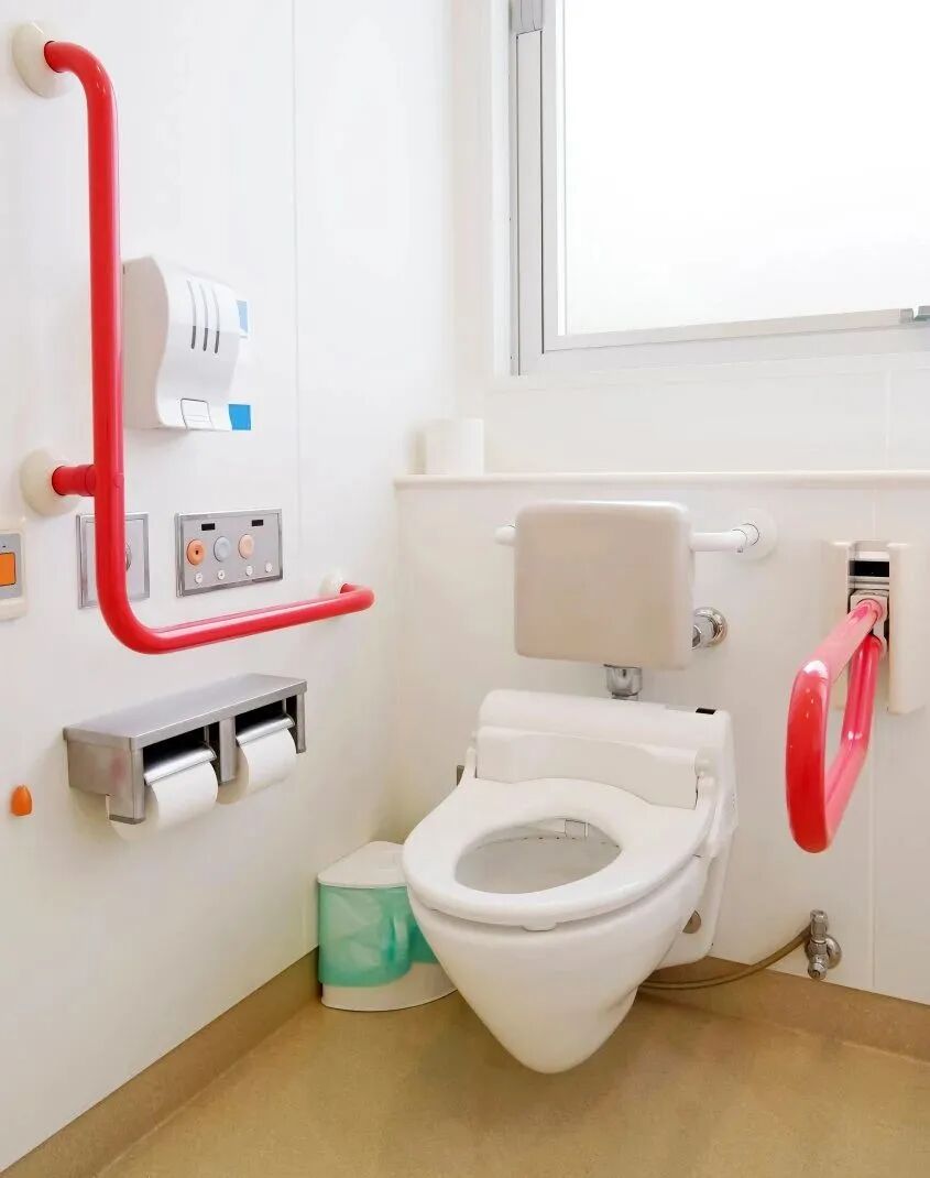 紧急呼叫按钮通常装设在无障碍卫生间的坐便器旁或卧室、起居室内,以便在坐厕或意外倒地的残疾人士及老年人作求助之用。因此,港标除上述要求外,还建议将呼叫按钮系以长度为700至 750毫米的长绳,使倒卧地上的人也能从地面不多于 300毫米处触及。英标也明确规定,应同时设置两个呼叫按钮,分别符合倒地及坐姿两种情况下的接触高度。