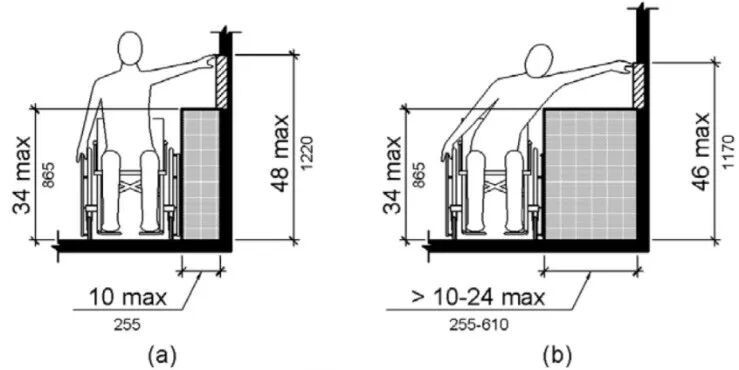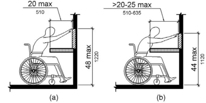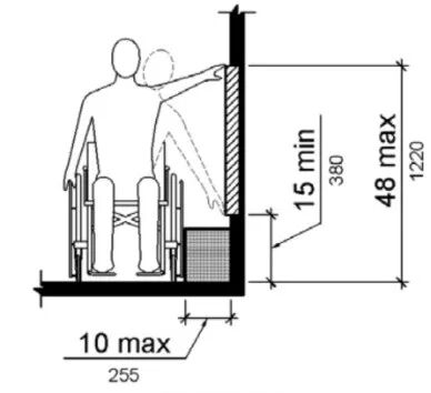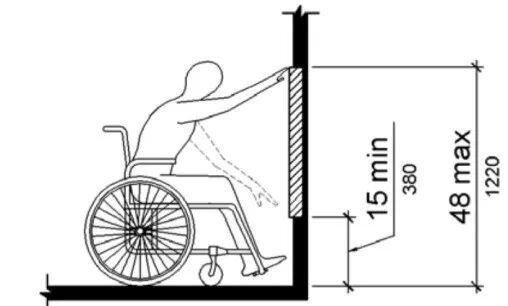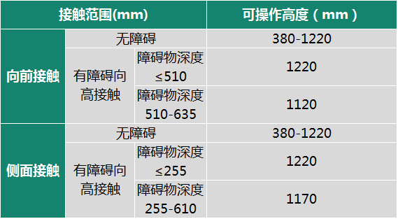不同于以上标准中对各装置高度进行的直接规定,美标从过程分析入手,将不同情况下轮椅人士的可接触范围按照向前接触和侧面接触两大类分别进行了讨论,每类又细分为无障碍接触和有障碍接触,进而以接触范围确定可操作高度,并规定各操控装置应符合该操作高度范围。