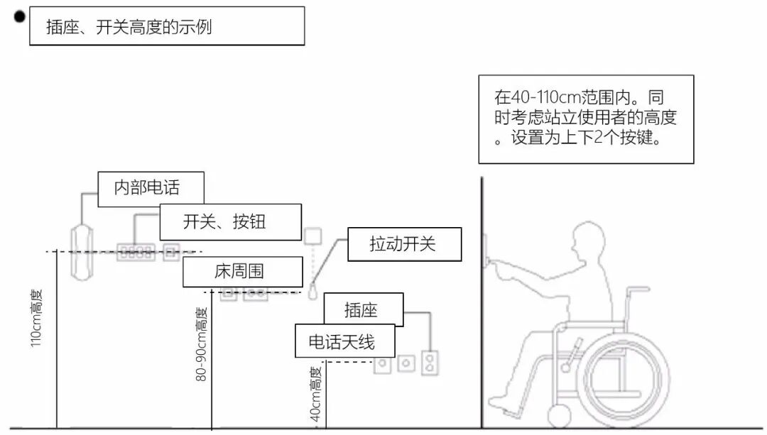 与把手不同,按钮、开关及插座类操控装置具有多种类型,高度范围也更加灵活。德标规定,如果需要使用多个操作元件,比如:多个开关需上下依次安装,最高开关的轴向距地尺寸不能超过105cm,最低轴向尺寸不能低于 85cm。日标则规定插座及天线等插口高度应为40cm左右,开关(不包括特殊开关)应为110cm左右(床周围约80-90厘米)。