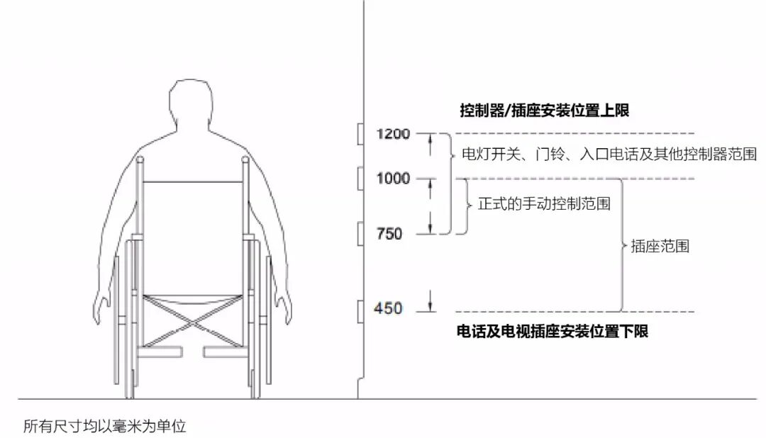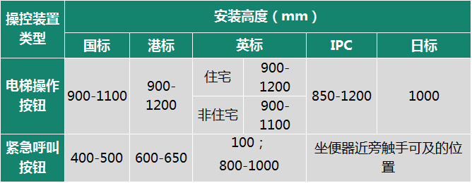总体而言,除特殊装置外(如紧急呼叫按钮),各国无障碍标准对各类操控装置的上限安装高度要求为1000-1200mm左右,开关、按钮、插座类装置下限高度为400mm左右,把手类装置下限高度为800-900mm左右。