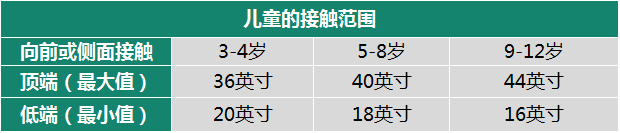 此外,美标还就儿童的接触范围进行了单独说明,并依据儿童年龄对操作元件高度进行了划分。美标对不同情况下接触范围的讨论,不仅可以指导操控装置的安装高度,还对家具部品的设计、空间的划分等具有参考意义。下表仅适于12岁及以下儿童。大人或 12 岁以上儿童应符合上述成人接触范围: