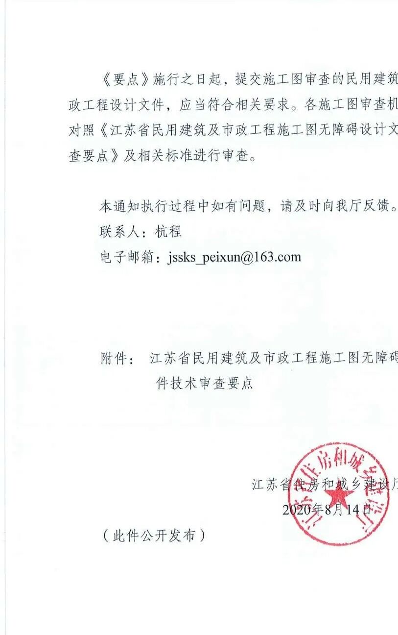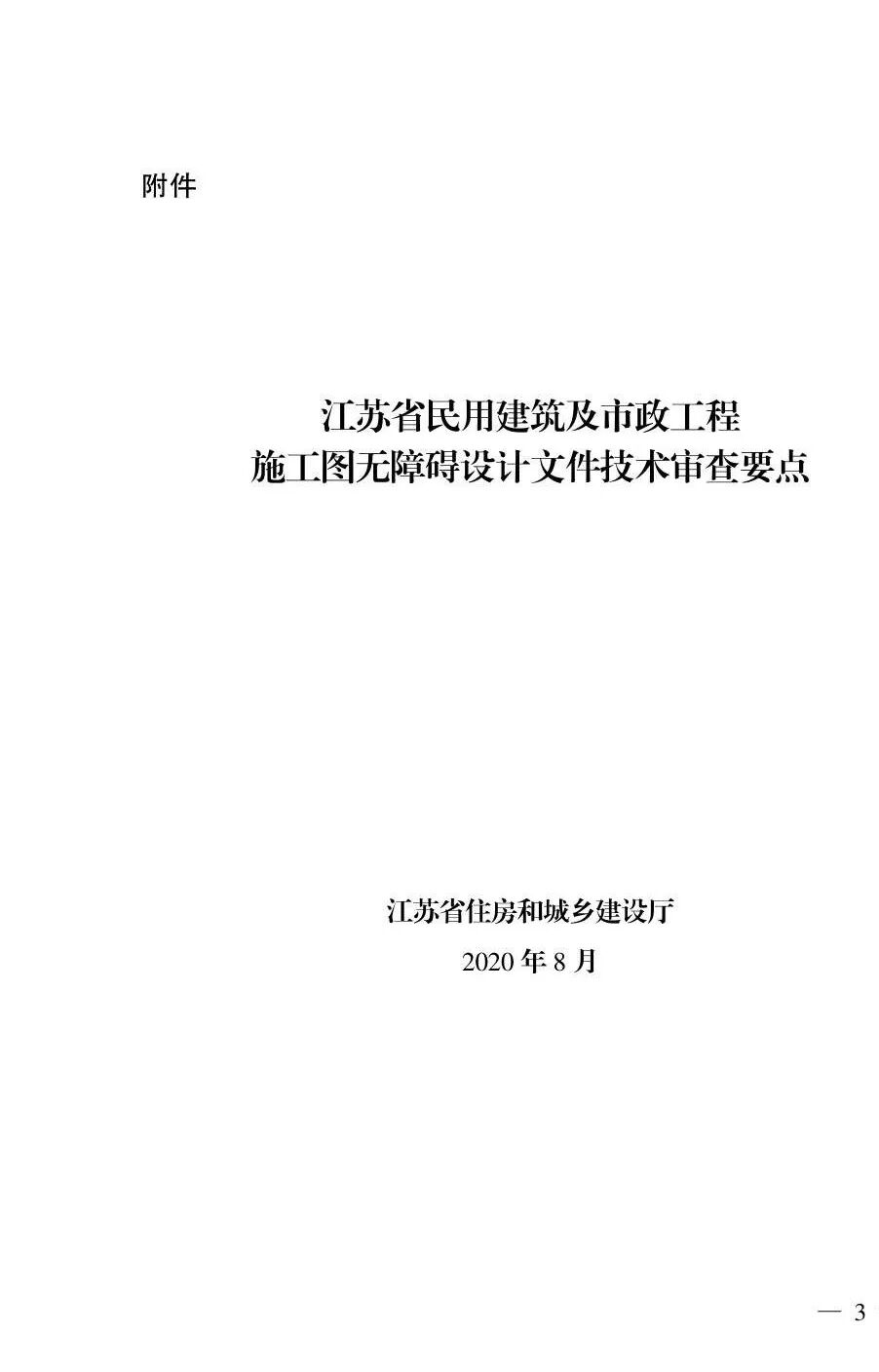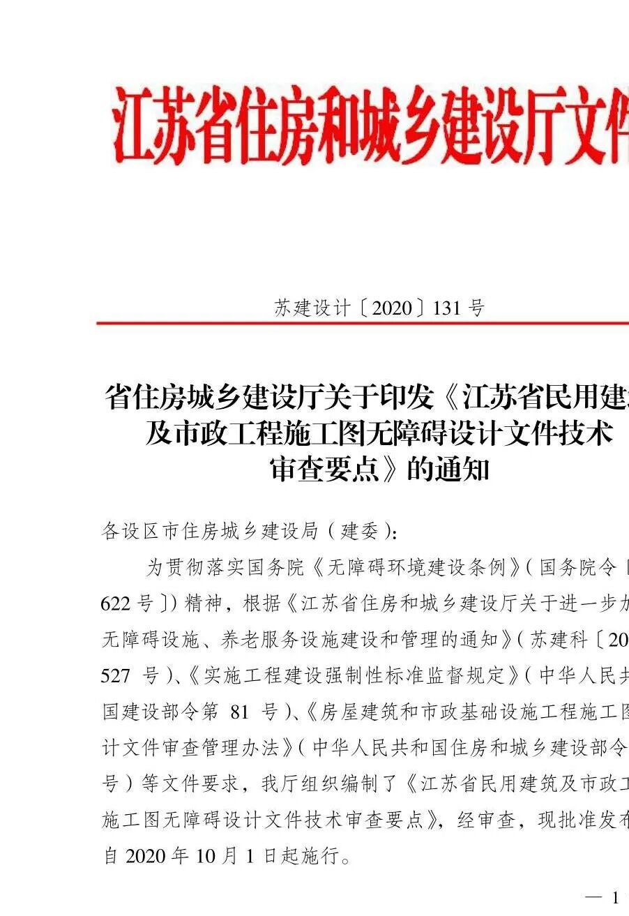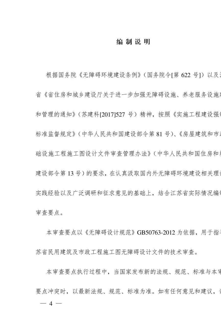 为贯彻落实国务院《无障碍环境建设条例》(国务院令〔第 622 号〕)精神,根据《江苏省住房和城乡建设厅关于进一步加强无障碍设施、养老服务设施建设和管理的通知》(苏建科〔2017〕527 号)、《实施工程建设强制性标准监督规定》(中华人民共和国建设部令第 81 号)、《房屋建筑和市政基础设施工程施工图设计文件审查管理办法》(中华人民共和国住房和城乡建设部令 13号)等文件要求,我厅组织编制了《江苏省民用建筑及市政工程施工图无障碍设计文件技术审查要点》,经审查,现批准发布, 自 2020 年 10 月 1 日起施行。