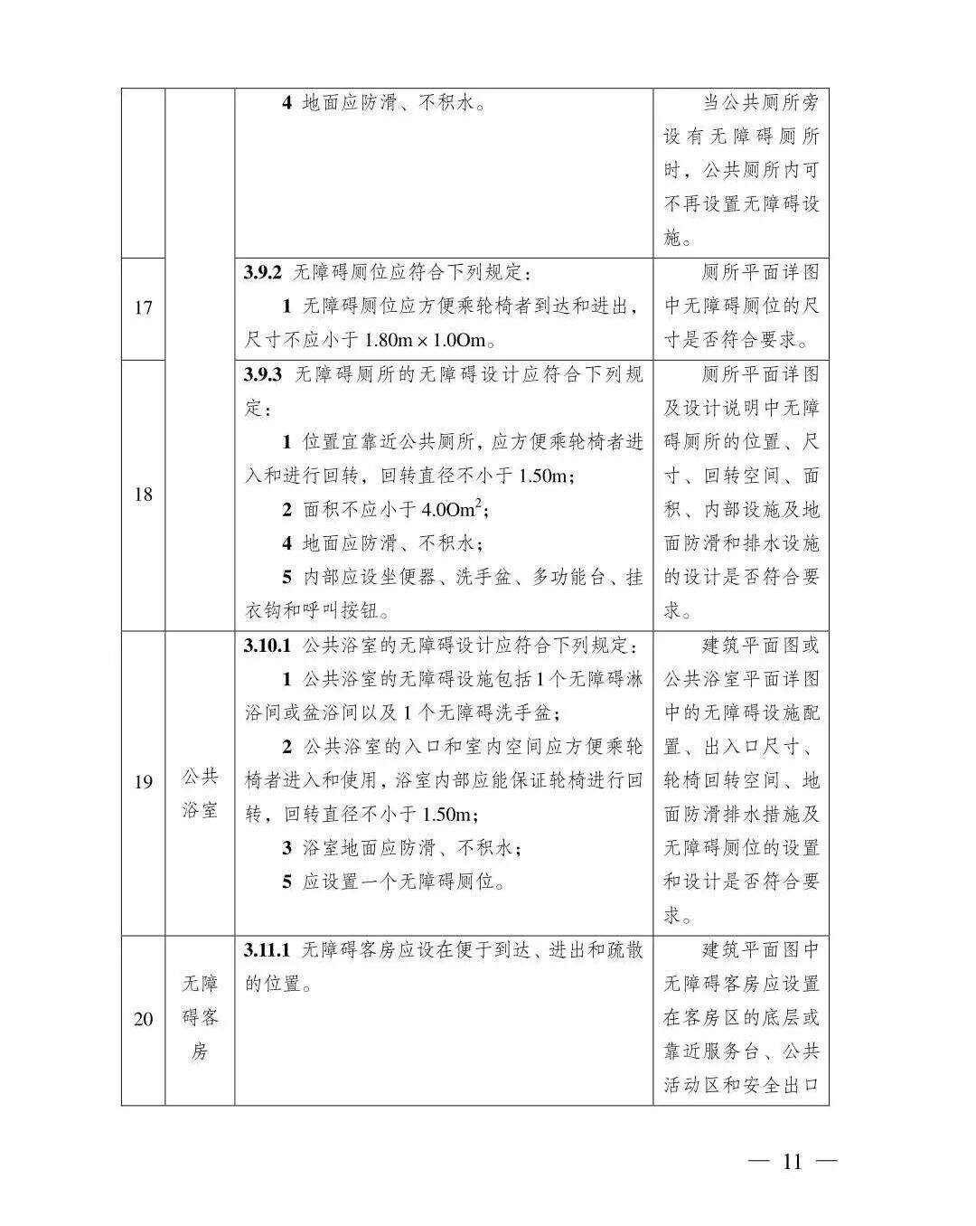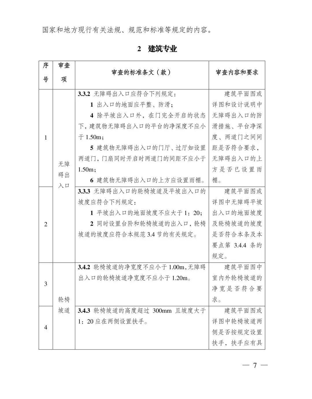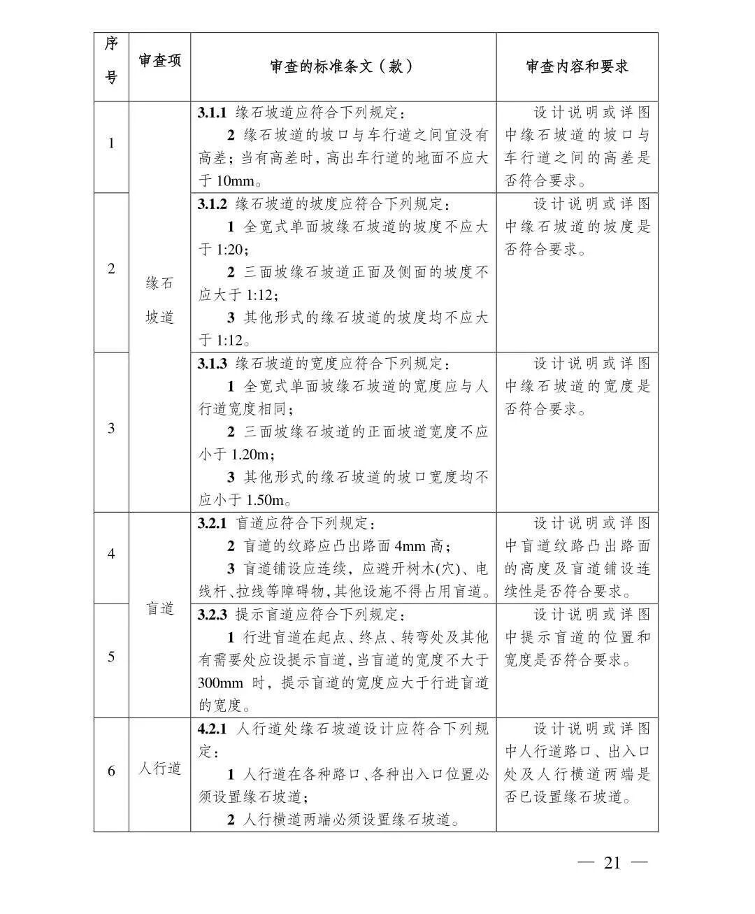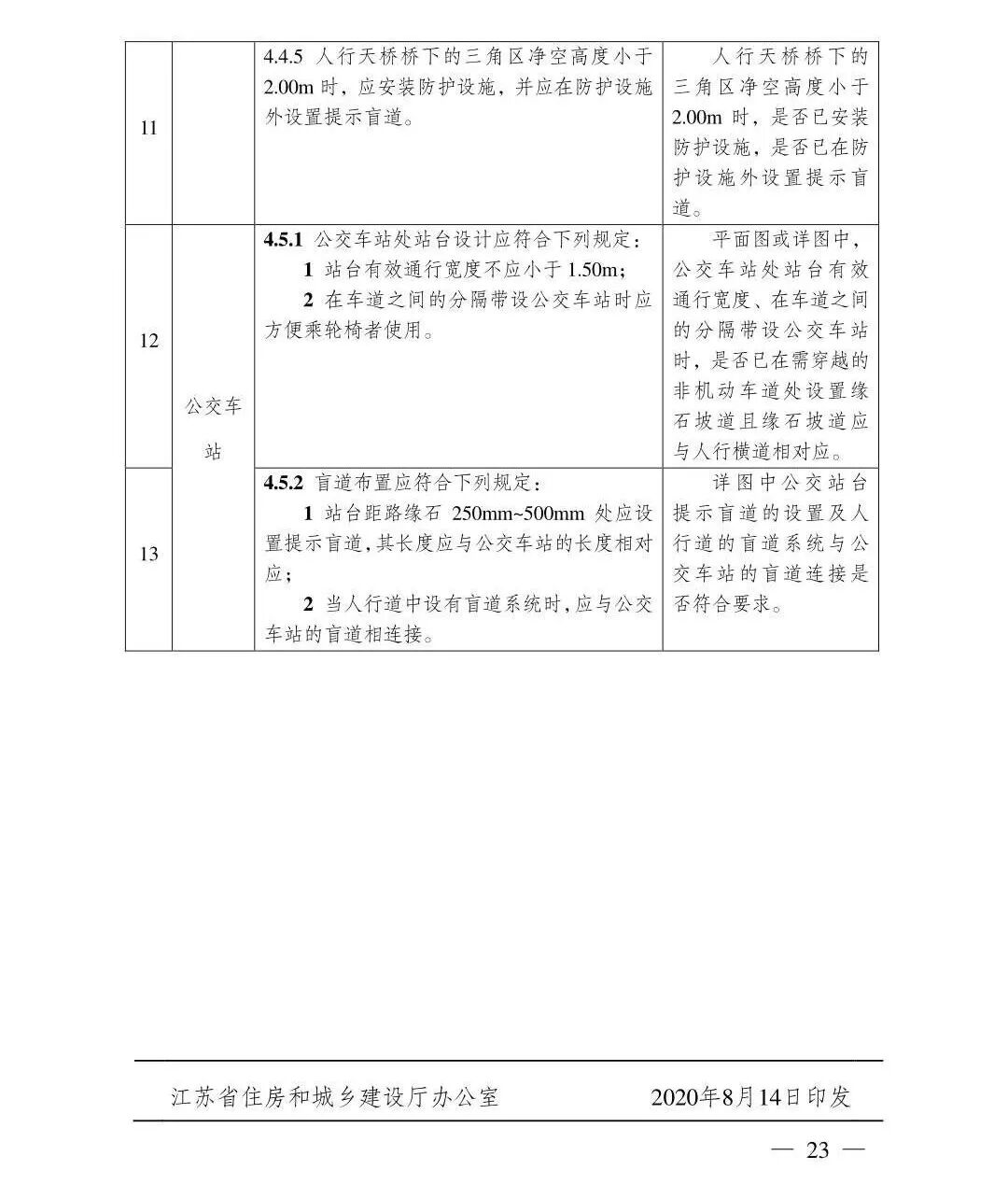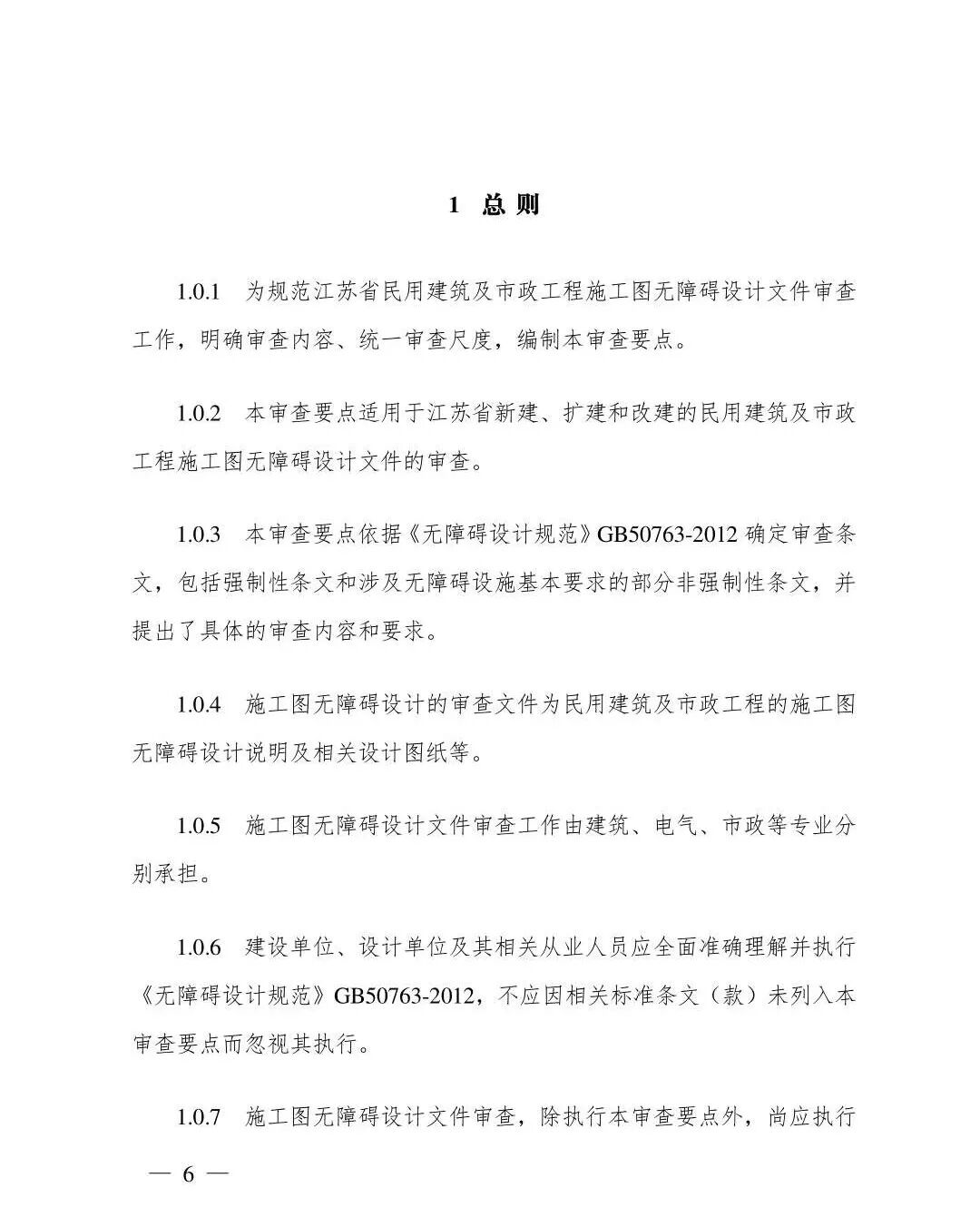 大美无障爱:发现美 传递爱 写在前面的话 这份文件很重要!它的意义在于全国第一个,具有开先河的意义!值得各地相关部门学习借鉴! 从源头抓起,从建筑设计源头抓起,让无障碍在建筑工程中真正落地,不留死角,不留遗憾,不建后再改,不劳民伤财!一直是近年来无障碍推进者和需求者最强烈的呼声!全国人大代表、中国残联副主席吕世明在全国人大建议中曾提到,我国无障碍环境建设快速发展,成效显著,但仍存在管理缺失、设计标准难以落实、施工质量不达标等问题。因此建议国家有关部门尽快制定《行业无障碍专项评审审查认证认可机制》,避免无障碍设施的缺位、形同虚设或是先建后拆。应尽快建立一套行业无障碍的专业评审、认证、监督、验收和处罚机制,这样可以从源头上保证无障碍建设系统完整、高标高质。 近日,江苏省住房和城乡建设厅组织编制的《江苏省民用建筑及市政工程施工图无障碍设计文件技术审查要点》正式下发,该文件强化机制,源头治理,前置审查、措施得力!此举对我国推进高质量、高品质、全覆盖无障碍环境建设具有重要的现实意义和深远的历史意义! 在全面步入小康社会的今天,无障碍已成为民用建筑和市政工程不可或缺的重要内容。无障碍是衡量建筑和城市建设的温度计。江苏省住建厅这份文件的出台,强有力地制止了无视无障碍的设计,实施无障碍设计图纸源头审查,这就是要在设计师头脑中固化深化无障碍理念这根弦,任何缺少或不规范的设计都会导致通不过图纸审查这一关,这种做法的提出是职能部门尽职尽责,对人民负责、对国家负责、对历史负责的体现!是新时代综合治理能力和水平现代化的提升!我们为江苏省住房和城乡建设厅点赞!希望各地无障碍推进者认真学习借鉴江苏做法,并在当地加以推广和推进! 本文件根据PDF文档进行转载,相关表格内容以图片形式展示,如给视障者阅读带来不便深表歉意,待相关网站推出后,我号再详细转载!