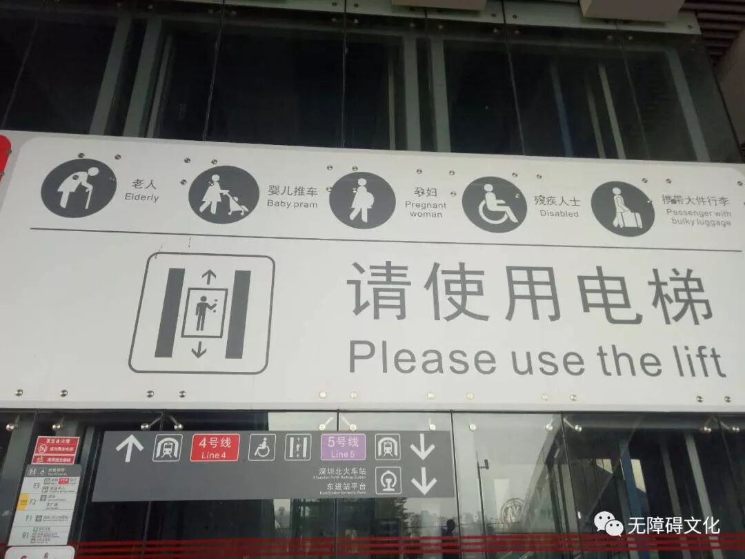 7、对深圳人性化无障碍标识的认识。深圳地铁换乘指示标识比较醒目,深圳北站直梯口可见大标识,很远即见方便换乘。