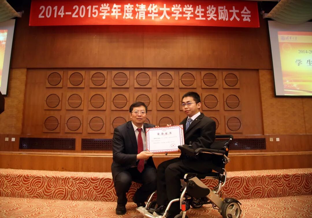 2015年清华大学学生奖励大会上,校长邱勇为获得“特等奖学金”的矣晓沅颁发获奖证书