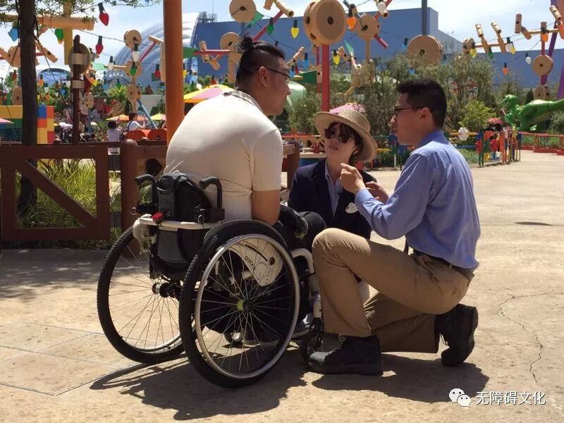 紧接着,迪士尼的一天体验是震撼比较大的。迪士尼给我的第一感觉就是一个主题游乐园,兴起于美国,香港后来有一个,是发达国家的代表做。这次无障碍的体验选择迪士尼只不过是因为它在无障碍方面做的先进,做得好。体验一天之后才觉得不是做得好,是太好了。开始只不过是以为卫生间好,道路好,坡道好,对于游戏项目也无非就是一些简单安全的可以体验,至于惊险刺激的就别考虑了。然而进去体验才知道,从卫生间到道路,从井盖到树坑,低位的水龙头,所有设计都非常人性化也特别通用。所有娱乐项目,都设有残障人专席,连转移需要的一些配套辅助设施都一应俱全。