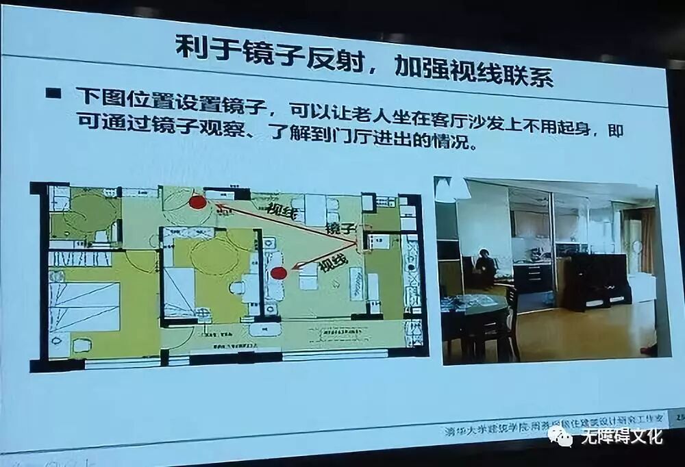 这是周教授为父母家设计的实例,巧妙地在客厅沙发对面的墙上安装了一面镜子,可以反射家门进出的情况。每次回到家里,冲镜子打一声招呼,坐在客厅看电视的父母就看到了,不用起身就知道是谁回来了;出门了一样,不用起身相送,冲镜子跟老人打招呼“我走了!”既方便又安心。