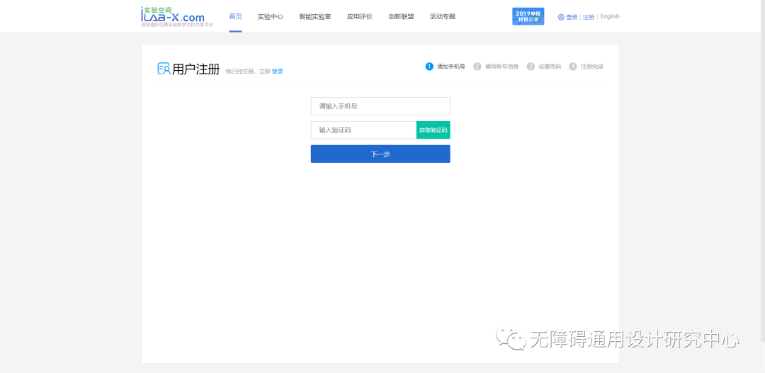 进入注册界面。如下图:在对应的地方输入手机号然后点击【获取验证码】,把手机收到的验证码输入到验证码区域,确认准确无误后,点击【下一步】