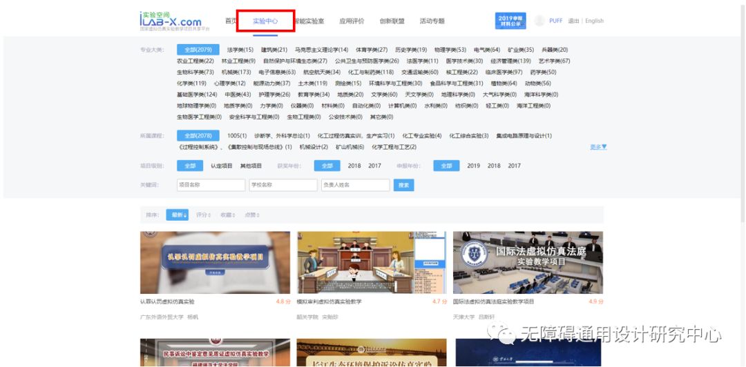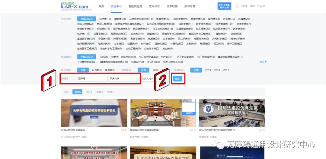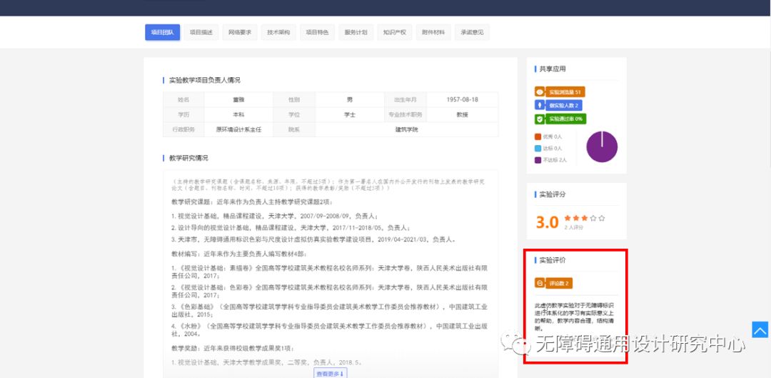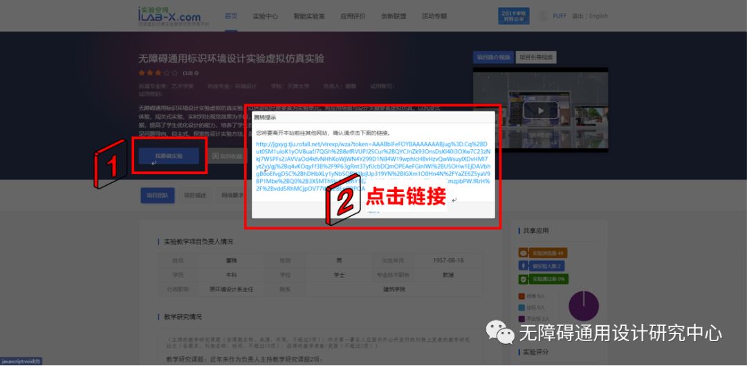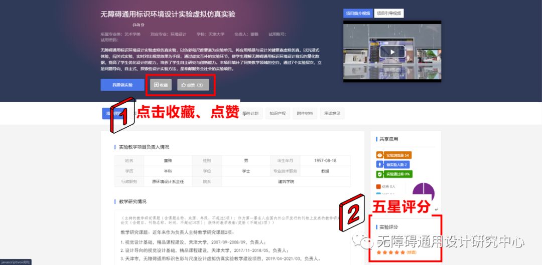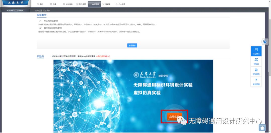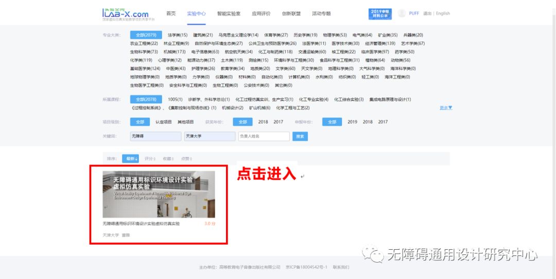 查找到本项目“无障碍通用标识环境设计实验虚拟仿真实验”。点击该实验进入项目详情。