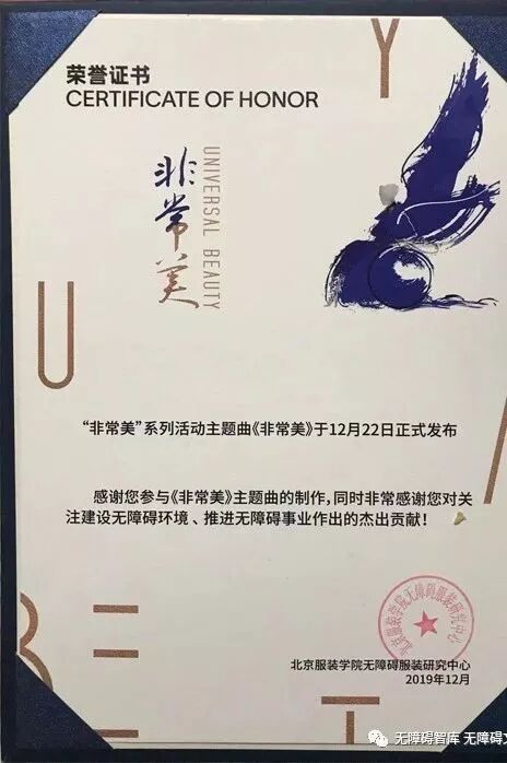 2019年12月22日,在北京服装学院“非常美”无障碍服装品牌发布会上,举行了我国首个无障碍专题歌曲——“非常美”系列活动主题歌首发式。由骆燕作词、潇萍谱曲的“非常美”主题歌曲现场发布;由北京市怀柔区肢残人协会主席宋继鸿,中国康复研究中心音乐治疗师、录音师宋宜川,北京服装学院在读学生徐子超、梁馨茹等4位歌手激情演唱;残健融合、完美演绎,为历时半年的“非常美”主题歌曲征集活动画上圆满的句号。