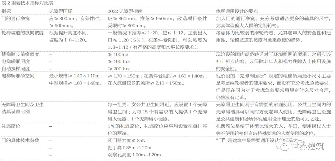 笔者有幸参加了《无障碍国标》的编制。编制开始于2010年,将通用设计理念因地制宜地贯彻到规范中去,是当时编制的重要原则之一。主要考虑了以下3点:早期的无障碍设计仅仅是满足残障人士尤其是肢残人士出行和参与社会活动的基本物质环境需求,而通用设计的服务对象是社会所有成员。借鉴通用设计理念,“无障碍国标”对无障碍设计的服务对象进行了扩充,其总则第一条即为:“为建设城市的无障碍环境,提高人民的社会生活质量,确保有需求的人能够安全地、方便地使用各种设施,制定本规范”。这里“有需求的人”不仅包括了残障人士、老人、孩童、孕妇、病人等一些由于自身生理阶段和身体原因行动或者交流不方便的人群,还包括其他在特定场景下“有障碍”的人群,例如,推婴儿车、提行李、语言不通的旅行者等。相应的,在“术语”一章,无障碍设施定义中的使用者由原来的“乘轮椅者”“残疾人”改为 “行动障碍者”“视觉障碍者”“听觉障碍者”。服务对象的扩充,必然带来无障碍设计准则和技术要求的调整,从而使得无障碍设计向着通用设计的方向发展。2.2 明确无障碍环境包括物质环境无障碍和信息无障碍《无障碍国标》设置了3.16节——无障碍标识系统、信息无障碍,这是首次在无障碍设计规范的条文中明确提出“信息无障碍”。其中要求:“应根据需求,因地制宜设置信息无障碍的设备和设施,使人们便捷地获取各类信息;信息无障碍设备和设施位置的布局应合理。”“信息无障碍”顾名思义是为各类人群提供获取和交流信息的便利。在各类信息获取和交流的障碍中,视觉障碍是最大的困扰,因此对于服务于视觉障碍者的无障碍设施并不是首次提出要求,例如盲道、盲文标识、语音提示等。在《无障碍国标》中沿袭原规范的条文位置,并没有单独纳入信息无障碍这一节。而这一节对于“信息无障碍”的要求也是偏原则性的,其实信息无障碍的设备和设施还有很多,例如为视觉障碍者服务的便携导盲定位设备、无障碍网站和电脑、读屏软件、助视器等;为听觉障碍者服务的电子显示屏、助听设备、同步传声设备、提示报警设备、可视电话等,在今后的标准制定和修订中,会酌情扩充具体的要求。今天,信息和生活已经密不可分,“信息无障碍”也应该不仅仅是获取和交流信息的便利,信息化的技术和服务也可以帮助解决很多生活的难题,例如网络或电话挂号,APP购物送货上门,手机地图导航无障碍路线和无障碍服务的公共场所,银行手机排队等,信息化和智能化可以衍生出大量的技术去服务人们各种情况下的需要。所以,“信息无障碍”可能会成为向着包容性迈进最快的领域。通用设计理念在《无障碍国标》的技术要求中也得到了体现。例如,建筑物出入口设置轮椅坡道,可以满足乘轮椅者、推婴儿车等行动不便人群的通行需求。但轮椅坡道对于另一些人是不方便的,例如,对于脚踝部受伤或残障的人的行走,对于视觉障碍者台阶比轮椅坡道识别性更强,对于年轻人台阶更直接和节省时间。这就出现需求上的矛盾。在建筑出入口同时设置轮椅坡道和台阶当然能够满足要求,但出于通用设计的原则,《无障碍国标》要求在出入口处优先选用平坡入口,同时要求坡度不大于1:20,并建议在场地条件允许的情况下做到不大于1:30,这种方式更加简便直接地满足了不同的需求。此外,《无障碍国标》建议人行道路口处优先选用全宽式单面坡缘石坡道、楼梯的两侧设置扶手等,其出发点都是通用设计。3 由《北京2022年冬奥会和冬残奥会无障碍指南》的制定深化无障碍设计向通用设计发展《北京2022年冬奥会和冬残奥会无障碍指南》(以下简称《2022无障碍指南》)是充分响应IPC(国际残奥委会)指南,并结合中国国情和法规体系制定的,以安全性为首要、体现通用设计理念、完善细节要求、适应本国特点。《2022无障碍指南》抓住以下4个方面的原则,促进了通用设计理念更加深入地贯彻:从理念、技术、管理3个大角度,《2022无障碍指南》的10个章节涵盖了一个综合的无障碍环境营建所需的大部分要素,包括服务对象、障碍分类、设施要素、技术要求、场所空间、信息、服务、管理运维等主要方面(表1)。既规定了设施的技术性能要求,也分章节对于不同的场所类型提出了不同建设标准的要求;既明确建设要求,也对于观念给予阐述,对服务和管理给予指导。考虑到使用对象包括奥组委、政府主管部门、建设单位、管理单位、设计单位、残联、志愿者、服务者等,具有极大的广泛性,《2022无障碍指南》投入相当大的篇幅进行无障碍理念的阐述和基本概念的介绍,希望利用这个盛会推行包容的无障碍理念,帮助社会形成无障碍环境是服务于所有人的共识。一直以来,中国的无障碍环境建设有着被动响应无障碍设计规范的倾向,造成了无障碍设施往往是附加在建筑上的,缺乏一体化设计。《2022无障碍指南》在先阐述清楚目标和原则的基础上,明确“硬性”的技术规定,同时充分鼓励设计师根据无障碍和通用设计的目标和原则进行合理创作,提升无障碍设计的品质。相比《无障碍国标》,《2022无障碍指南》有近70项有所深化和细化的技术标准。表2罗列了其中9项相对比较重要的性能指标,可以看出,大多是出于通用设计的考虑进行的细化和深化。
