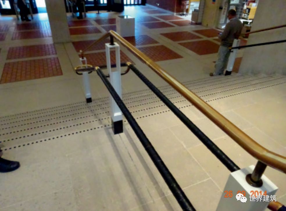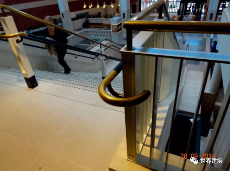 老幼病残人士的疏散和救援是当今的一个难题,一些国家在法规中有所强调,但是在中国的法规中还没有明确的规定,仍处于研究和逐步完善的阶段。有一些有益的尝试可以借鉴,例如在中国的规范中,电梯是不能用作疏散的,但在美国已经开始尝试通过技术措施提高电梯的性能和安全可靠度,将电梯纳入灾害疏散的工具之一,不只是消防队员可以使用,一般的民众都可使用。(2)精细化:通用设计的原则往往是贯彻在环境细节中的。细节处理非常重要,需兼顾牢固、安全、美观、易用,充分体现人性化。细节中表达的人性关怀往往能令使用者感到温暖与善意。例如公共图书馆内的楼梯,每一步台阶边缘有所提示,保证安全性,设置中间双道双层扶手,扶手的尺寸和材质(通长部分以皮革包裹)考虑人手抓握的舒适和便利,末端处理适合老年人扶拉(图3、4)。3.4 精细化的楼梯及扶手设计(英国伦敦大英图书馆)