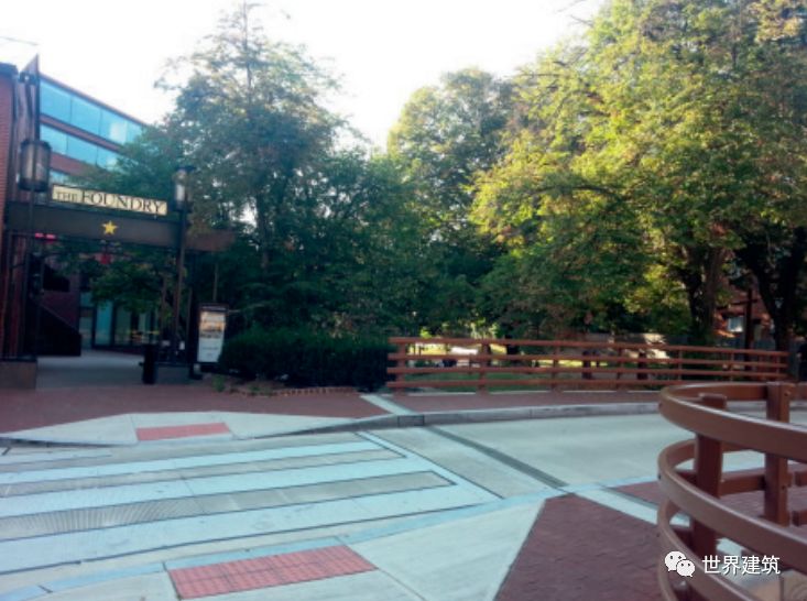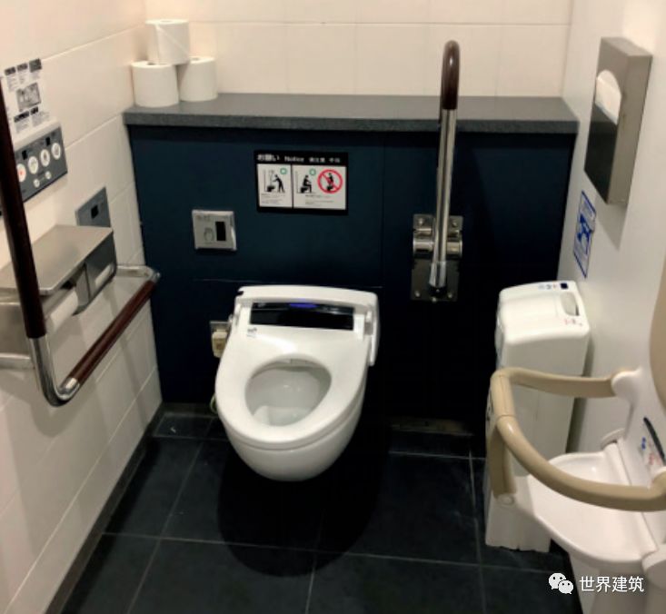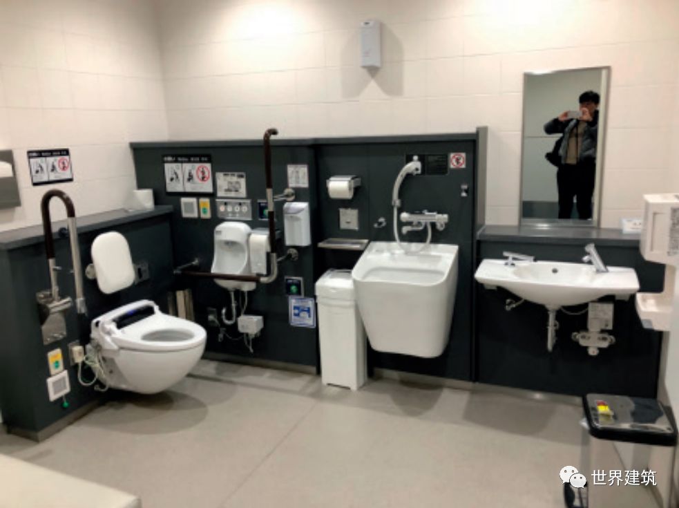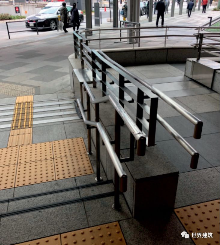 通用设计是将功能上的便利性和无障碍目标融合在设计的整体语言中,一体地去表达。可以说“通用设计”是一个动词而不是一个名词,没有一个固定的标准,只有更好的可能性。以通用设计的理念去审视和完善建筑中的部件和设施,是当下建筑设计领域亟待开展的工作。近些年,一些重要的无障碍设施已经得到修正和提升以贯彻通用设计的理念,例如:(1)盲道:一直是无障碍设计和研究领域争议很大的设施。盲道是非常有效的无障碍辅助设施,但铺设的不合理,其本身也可能构成一种障碍。有很多地方的无障碍环境建设刚刚起步,盲道已经铺天盖地,对此已有不少质疑。经过调研,发达国家均不鼓励无原则地大量铺设盲道,而是根据人流量和功能需要合理铺设。例如,大人流的公共交通建筑出入口,合理设置行进盲道和提示盲道(图6);郊外的小镇,仅在路口处设置醒目的提示盲道 (图7)。在《无障碍国标》中,对什么部位和区域铺设盲道给出了具体的要求,对于行进盲道和提示盲道也给予不同的重视程度,引导合理设置盲道。(2)无障碍厕所:指的是有无障碍设施的单独的无性别厕所。很多老年人、病人是夫妻相携出行,或者父母带着异性的孩子出行,无障碍厕所提供了方便。在发达国家,这种厕所里的设施越来越多,也能够照顾到越来越多的需要,例如照料婴儿、更衣、更换尿袋等(图8)。但在中国的大部分公共建筑中设置的数量远远不够,且平时管理疏忽,有大量的废置和挪用现象,能够正常使用的,其内部设施大多也比较基础。(3)平坡出入口:应该大力提倡公共服务的建筑首先做出表率,主要出入口设置坡度小于1:30的平坡出入口(图9)。现在一些建筑师已经将其作为自己设计的“规范”了。无论如何,不能再用一个旮旯角的次入口设一个小坡道去“搪塞”无障碍的要求。