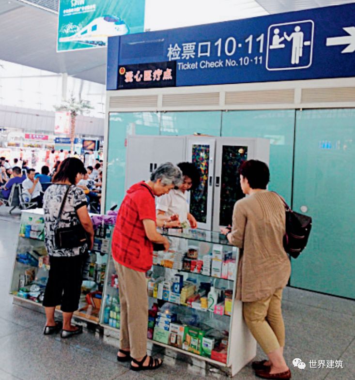 (3)卫生和健康:促进公共卫生与健康是通用设计的重要组成部分,包括室外环境中园林绿化、开放空间、健身设施、儿童游戏设施等,室内环境中良好的通风、日照、照明、声音等,还包括将楼梯间设计为可促进居民交往的场所、在公共走廊设休息座椅、住宅中设自然晾晒处、设置宠物设施等。以及大人流公共场所中的健康服务,如中国高铁站内设置的便民医疗点(图5)。