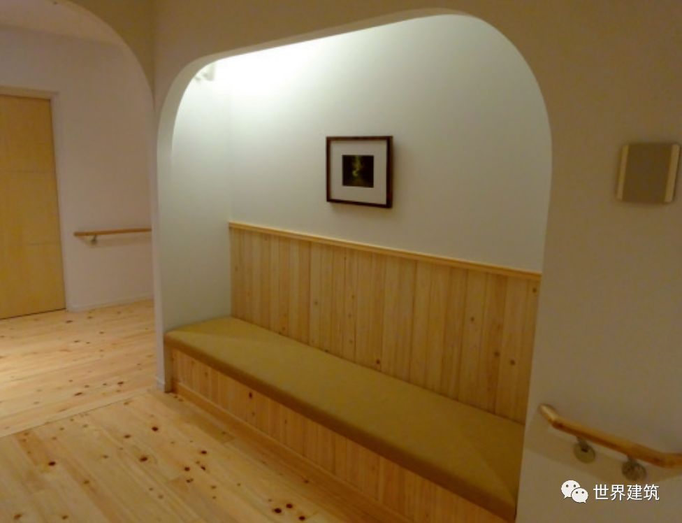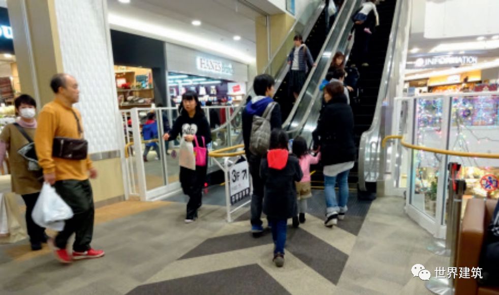 刚才提到过,环境的适老性属于通用设计的内容,需求非常迫切。虽然我们常说“老残一体”,老年人和残障人士的无障碍需求大部分是重叠的,但是也有部分的差异。然而,如果认为在偏重“适老性”的设计中就可以降低无障碍设施的技术标准,那就是大错特错了。老年人面临全面的生理衰退,不但包括行为能力上,还有感官上。对于环境和设施会提出一些比较细化的要求。老年人更多地需要扶手,扶手的材料选择和构造处理应符合老年人的行为特征和舒适度的要求。公共厕所可以设置较大比例的厕位,内部空间适当放大些尺寸,设置一些辅助设置,就很方便老人以及带孩子的人使用(图10);在自动扶梯前设置扶手,方便老人上下(图11)。此外还有在公共空间多提供老年人休息的座椅(图12);消灭地面小高差,一个小门槛可能就是隐形的杀手;环境的构筑不能很复杂、很有个性,需要明朗的状态(图13)等。10 方便老人带孩子的人使用的厕位(日本东京羽田机场)