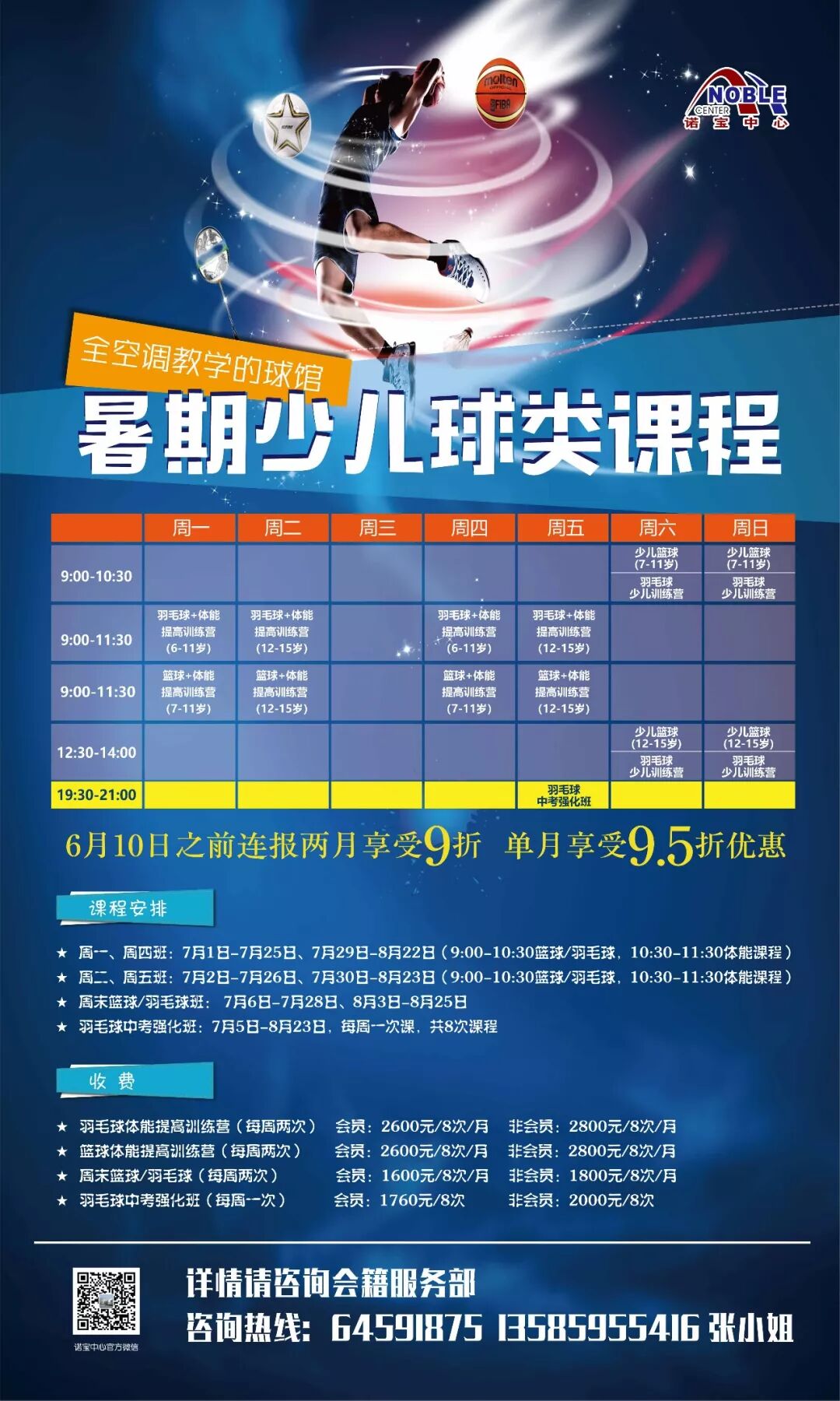 羽毛球+体能提高训练营 篮球+体能提高训练营 周一、周四班 7月1日-7月25日、7月29日-8月22日 周二、周五班 7月2日-7月26日、7月30日-8月23日 周末篮球班/羽毛球班 7月6日-7月28日、8月3日-8月25日 羽毛球中考强化班 7月5日-8月23日,每周一次课,共8次课程