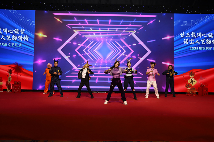 汇演在诺宝美爱乐队活力四射的《新年贺岁串烧》中拉开序幕。欢快的节奏瞬间点燃现场,主持人登台送上诚挚祝福,全场洋溢着节日般的喜悦与归属感。