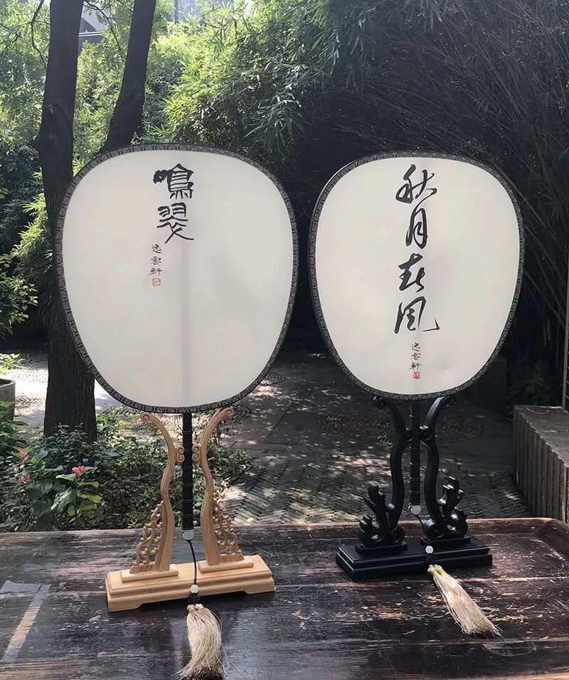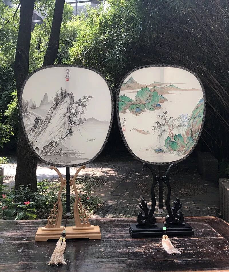 团扇至少在汉代就出现,因团圆似明月故称 “团扇”或“合欢扇”。扇面或以书墨或以刺绣,绘山水楼台、草虫花鸟,精巧雅致。