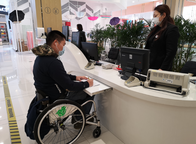 潘逸飞在为轮椅人士专设的低位服务台前填写服务单