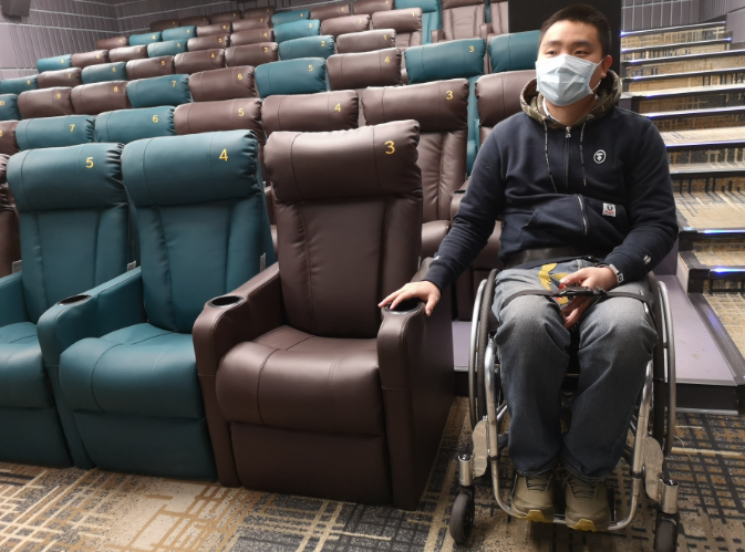 记者注意到,商场外近百个车位中,设置了4个无障碍停车位,中间画有无障碍标识,这种车位比普通停车位宽,左右两侧各有约1米宽的轮椅下车区。商场内每层设有无障碍直梯、低位服务台,5个楼层中1至4层设置了无障碍卫生间。商场影院疫情期间尚未开放,目前每个影厅第一排边侧设置了两个轮椅坐席。“这几年越来越多轮椅人士愿意外出体验观影,没有轮椅席位,就只能到最后一排或者第一排墙边。我去过的影院中,现在有轮椅坐席的还很少,希望以后能够逐渐普及。”潘逸飞说。