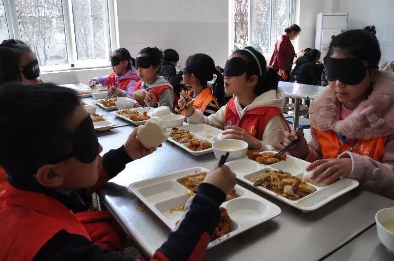 中午的吃饭环节更让大家深有感触。因为需要带着眼罩吃饭,大多数人乱了阵脚,不是夹不到菜,就是手伸进了稀饭碗里,最后靠手的摸索和定位,才慢慢习惯用筷子夹到菜,这顿饭也吃得特别有意义。